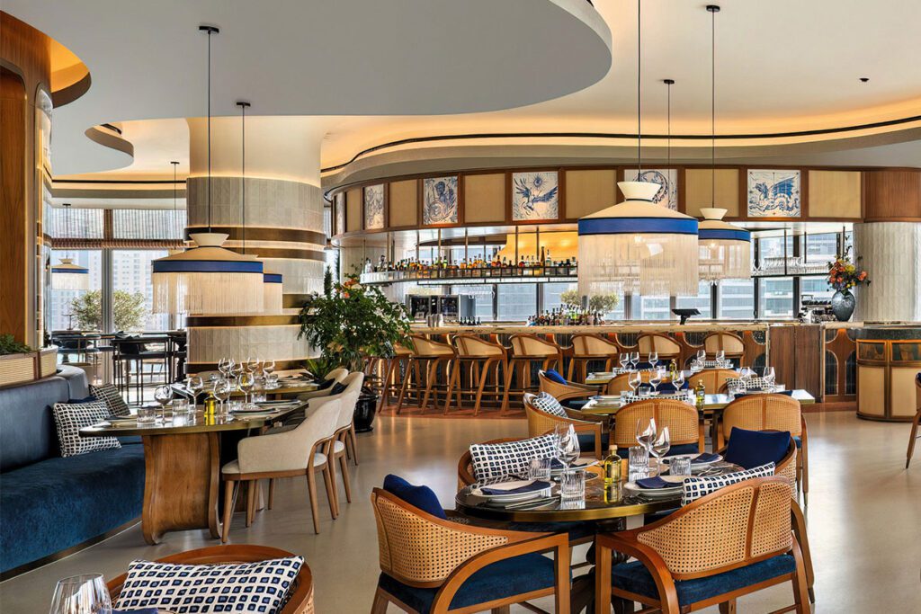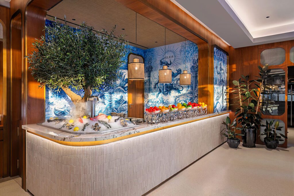 The entrance and reception set a welcoming tone with greenery, marble, wood, and soft blue accents. The culinary counter becomes a stage, featuring a seafood display, olive tree, and hand-painted tiles.