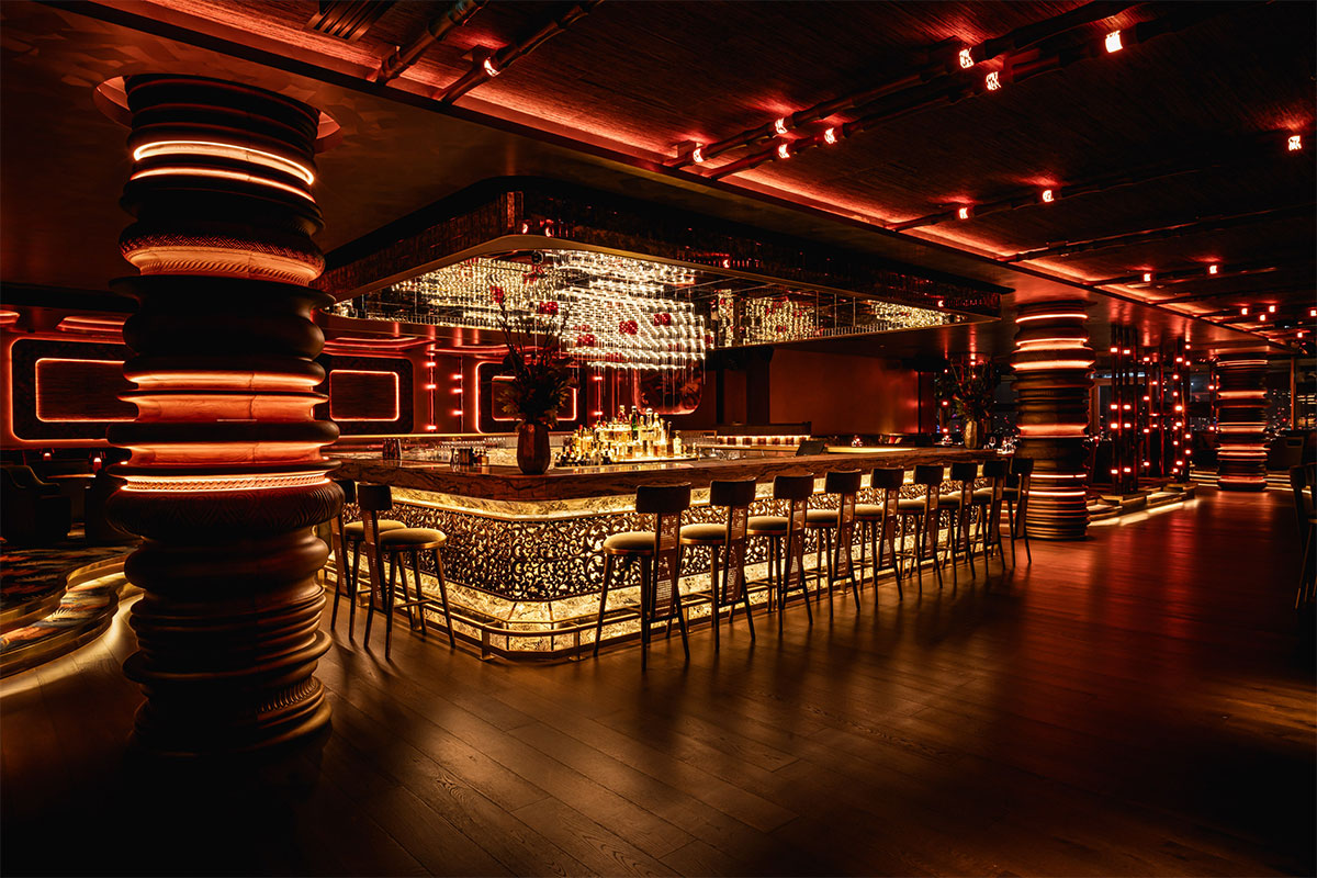 By day, filtered light and marina views create a relaxed atmosphere; by night, layered lighting adds warmth and vibrancy.