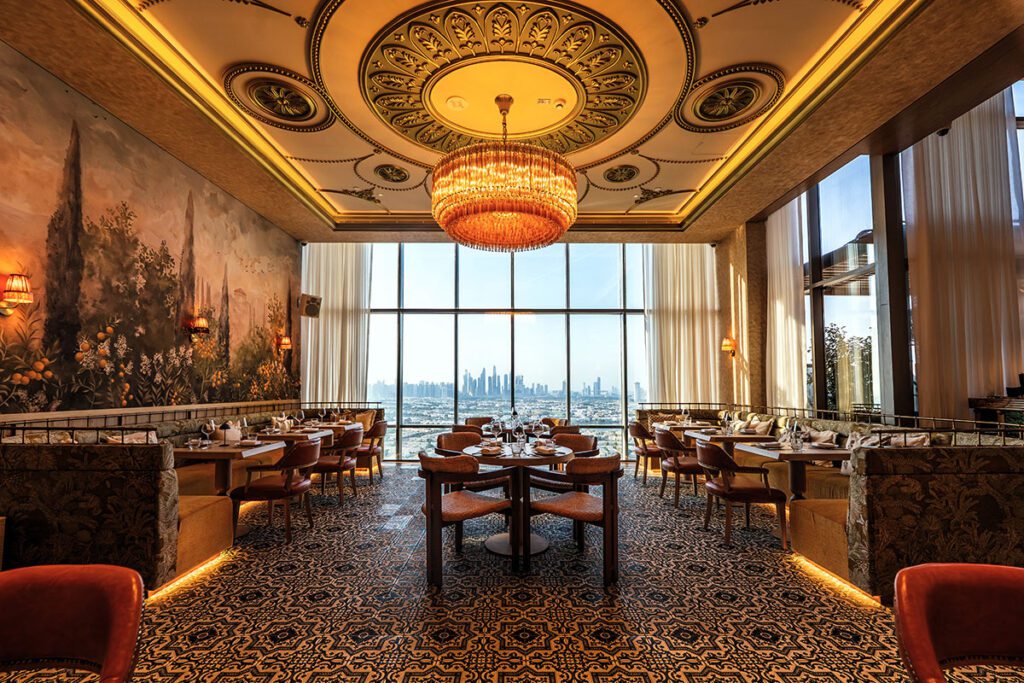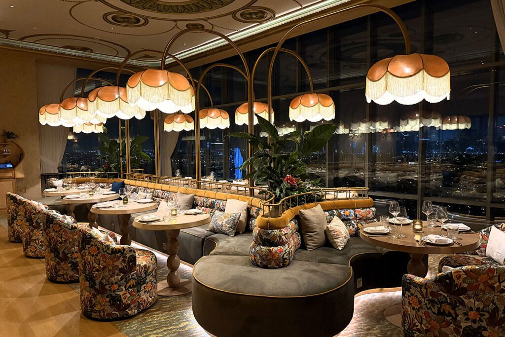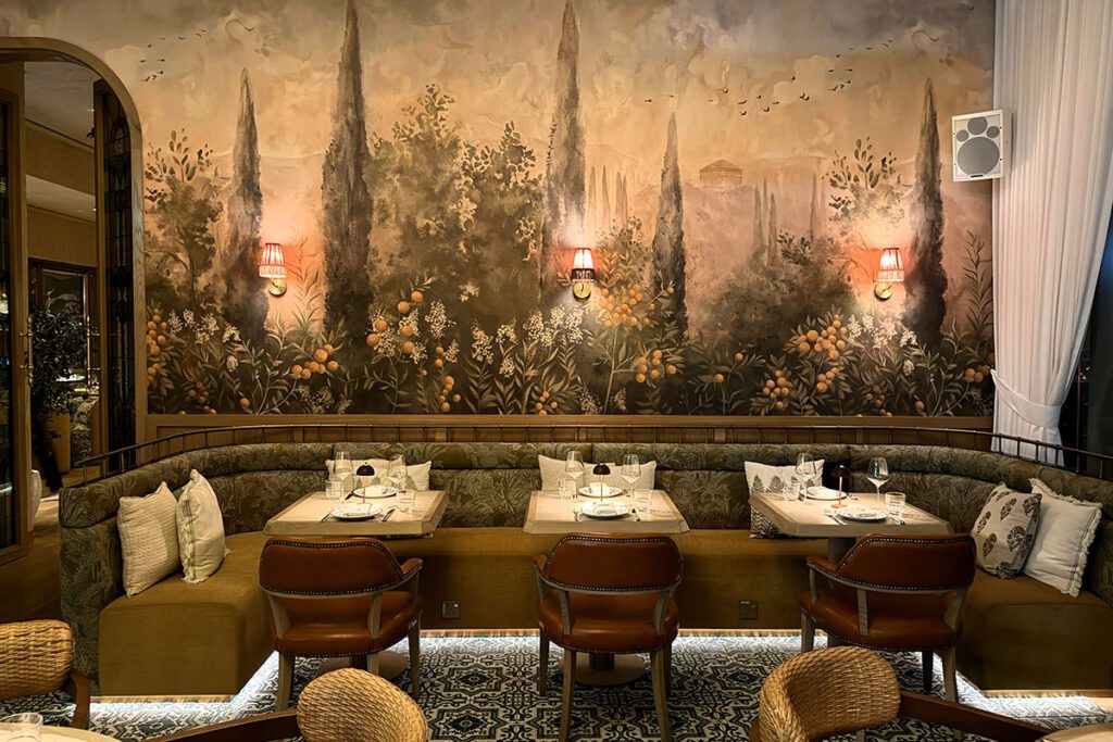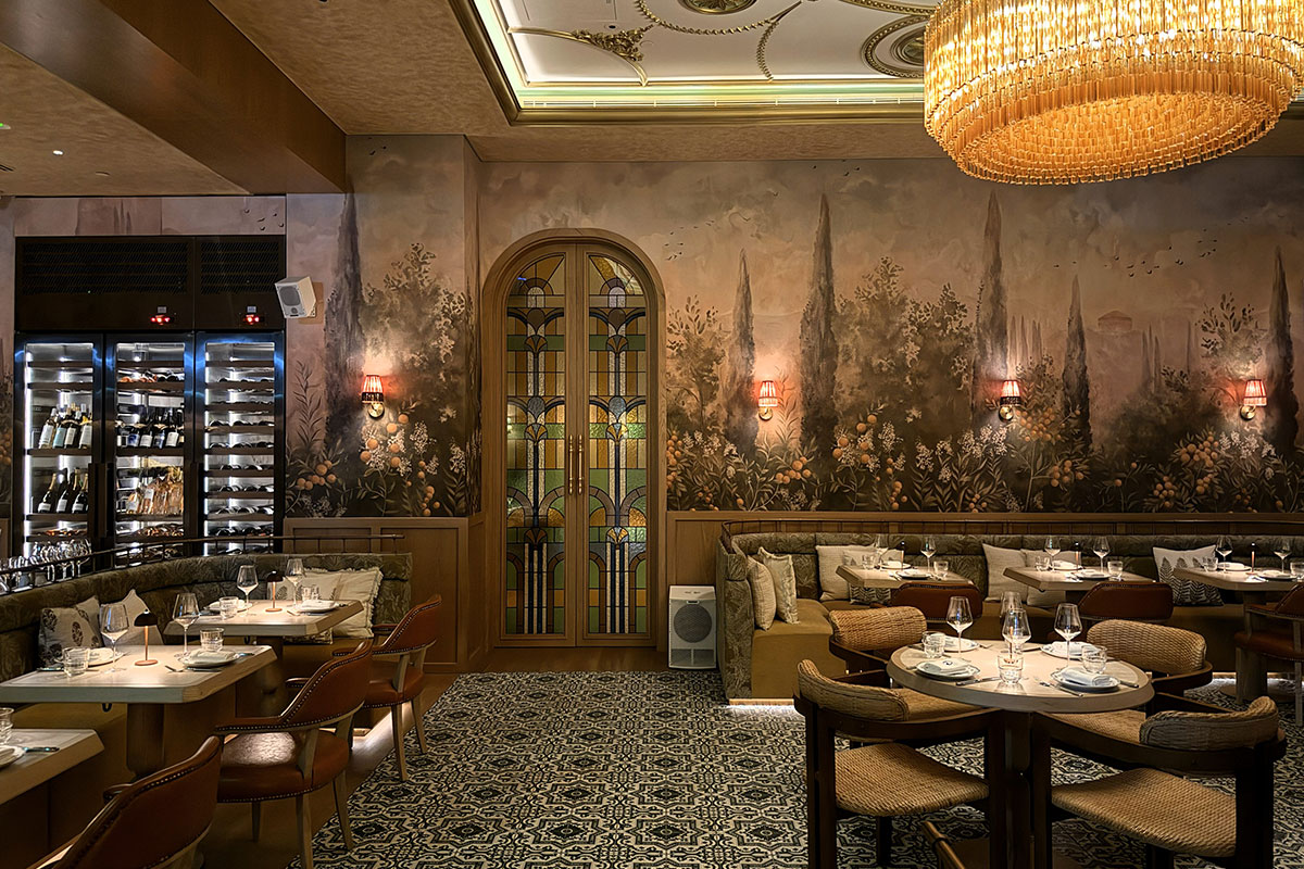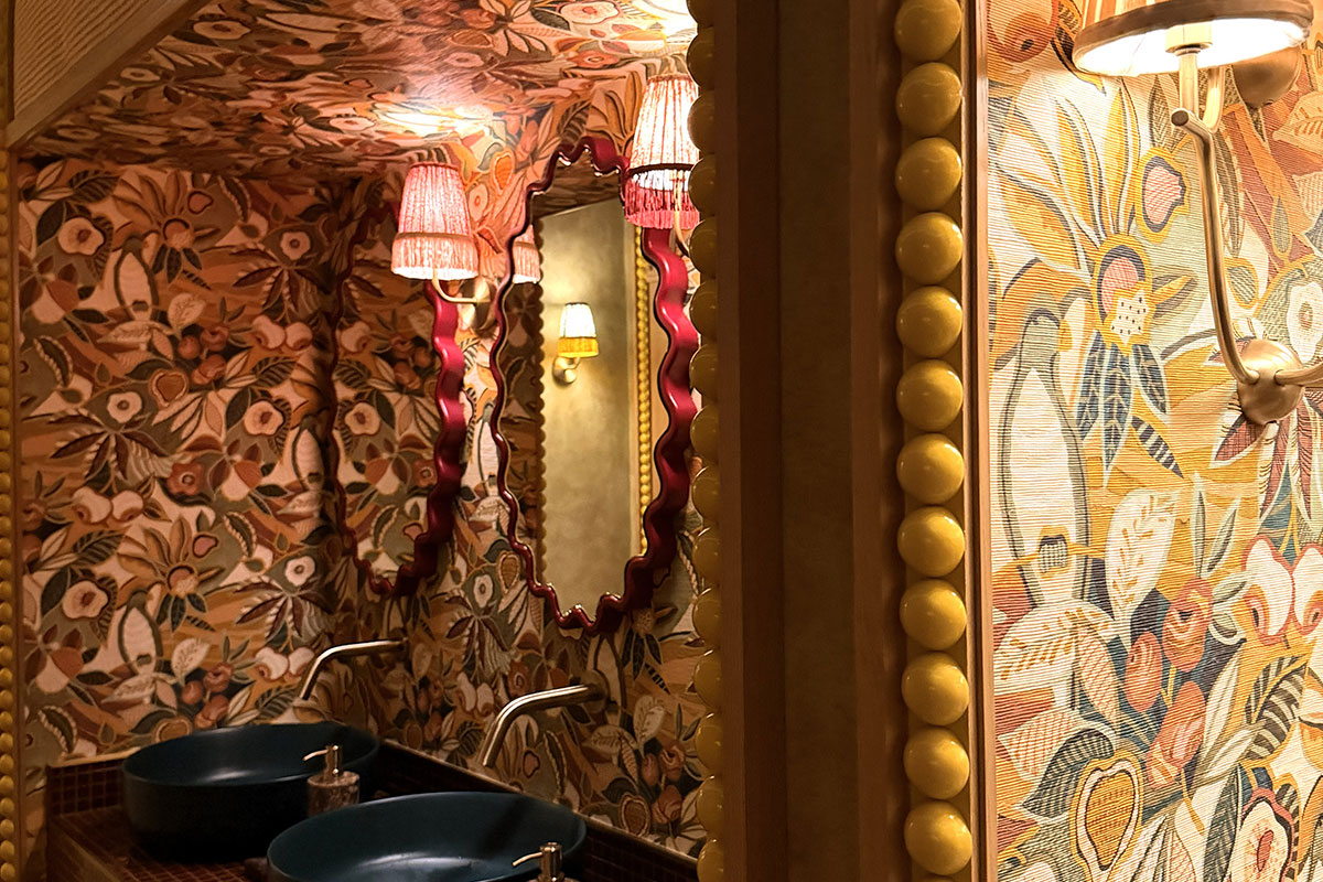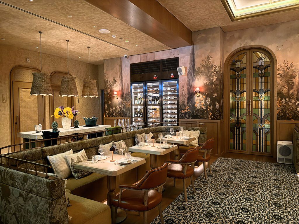 The arrival sequence sets the tone with green arches, patterned tiles, woven ceilings, and soft, ambient lighting.