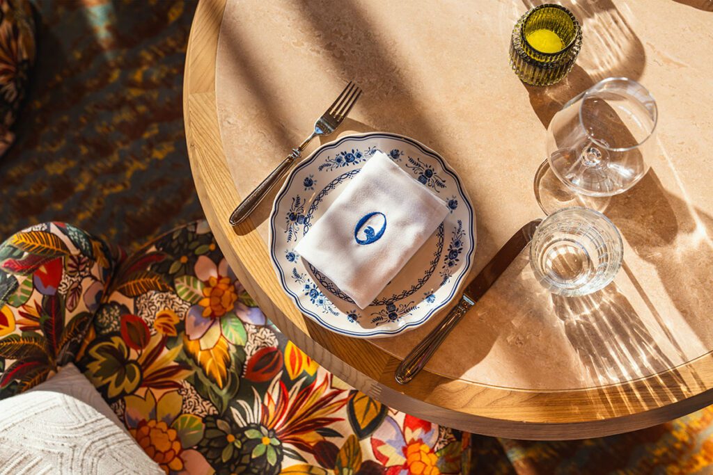 Outdoor spaces extend the experience with wood, rattan, terrazzo, and vibrant fabrics.