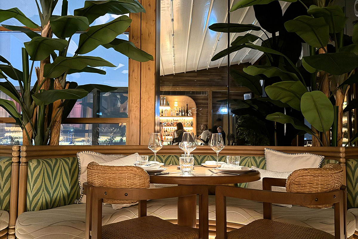 The lounge area blends music, texture, and greenery, with seamless indoor–outdoor transitions.