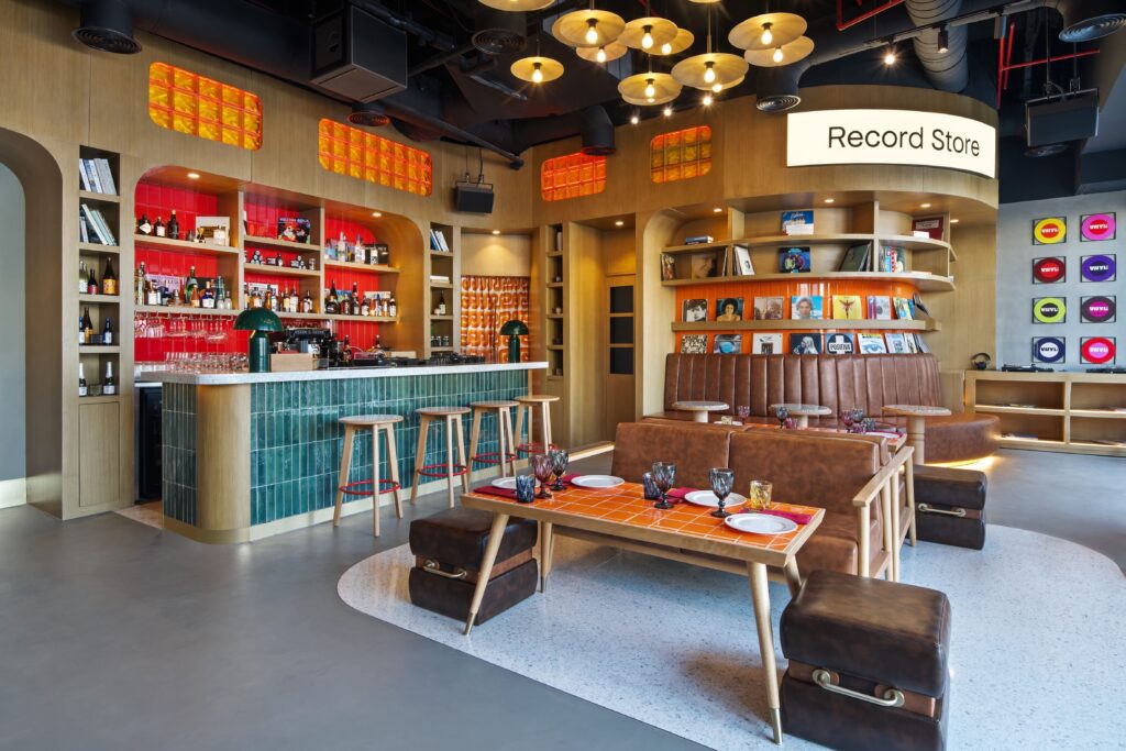 Paying homage to iconic ateliers like Electric Lady Studios, where The Rolling Stones, Stevie Wonder and David Bowie all penned legendary lyrics, the 3,500ft2 venue boasts exposed ceilings, an abundance of laminated wood cladding, and built-in display cabinets jam-packed with classic records..