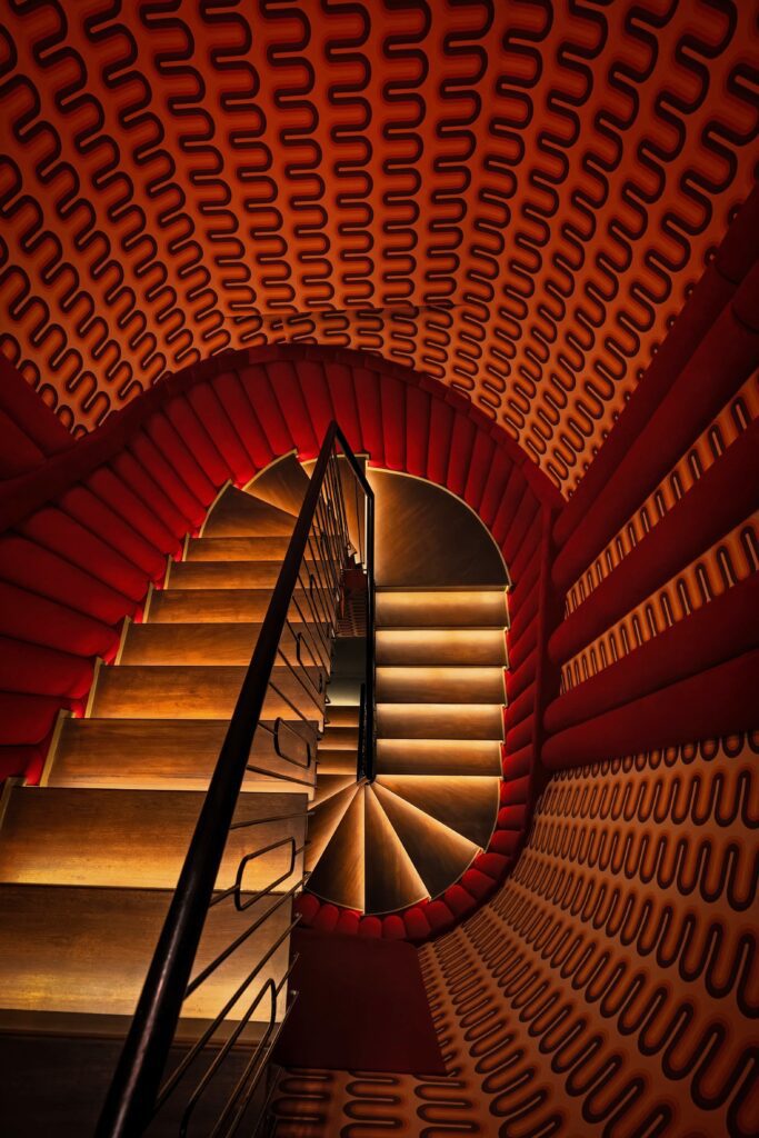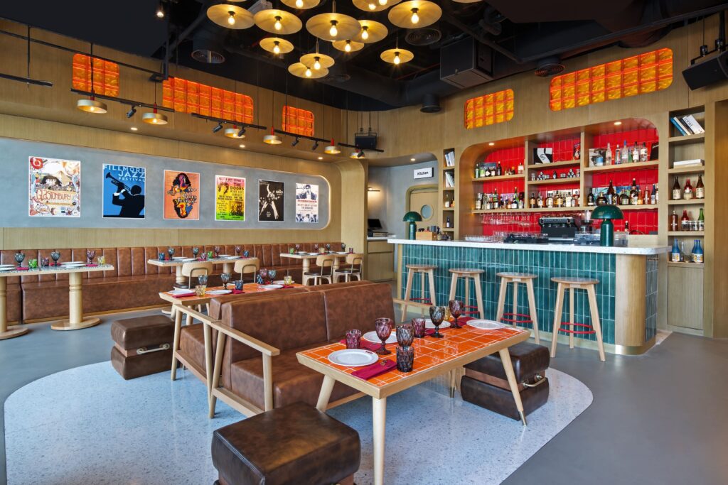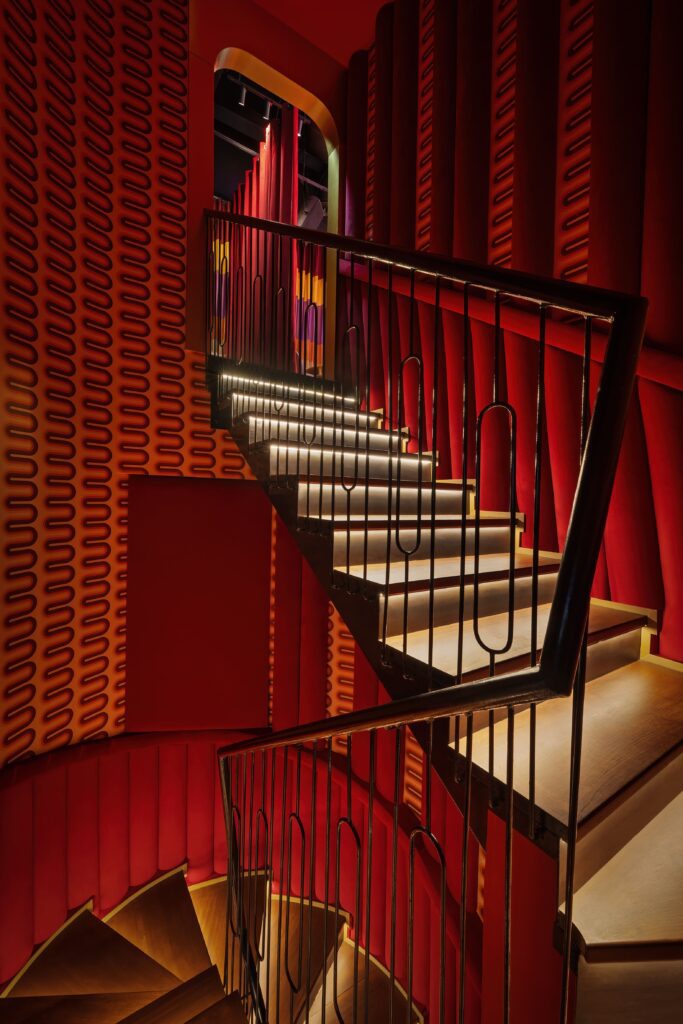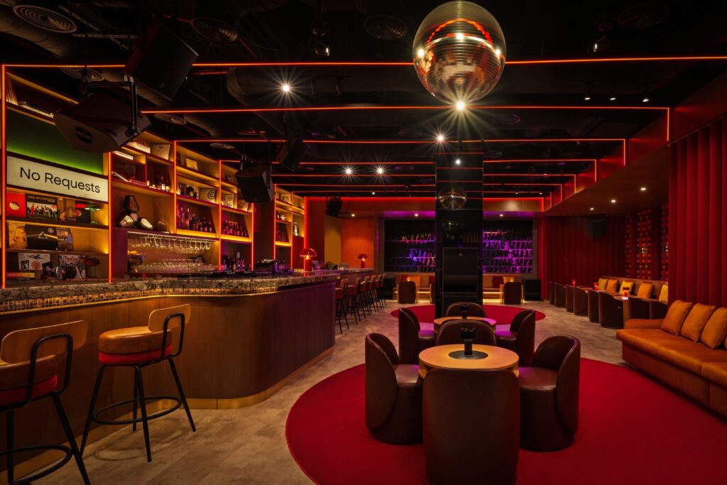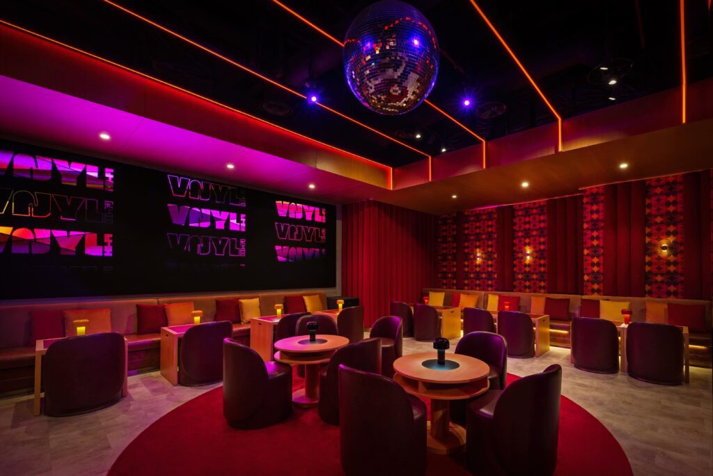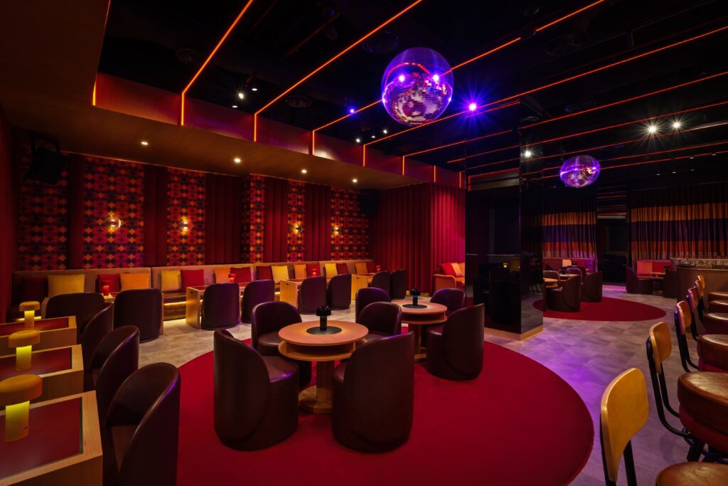 Oversized disco balls sparkle above rich red carpets, while retro-patterned wallcoverings enhance the nostalgic ‘70s narrative.